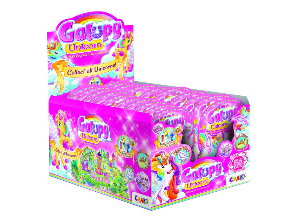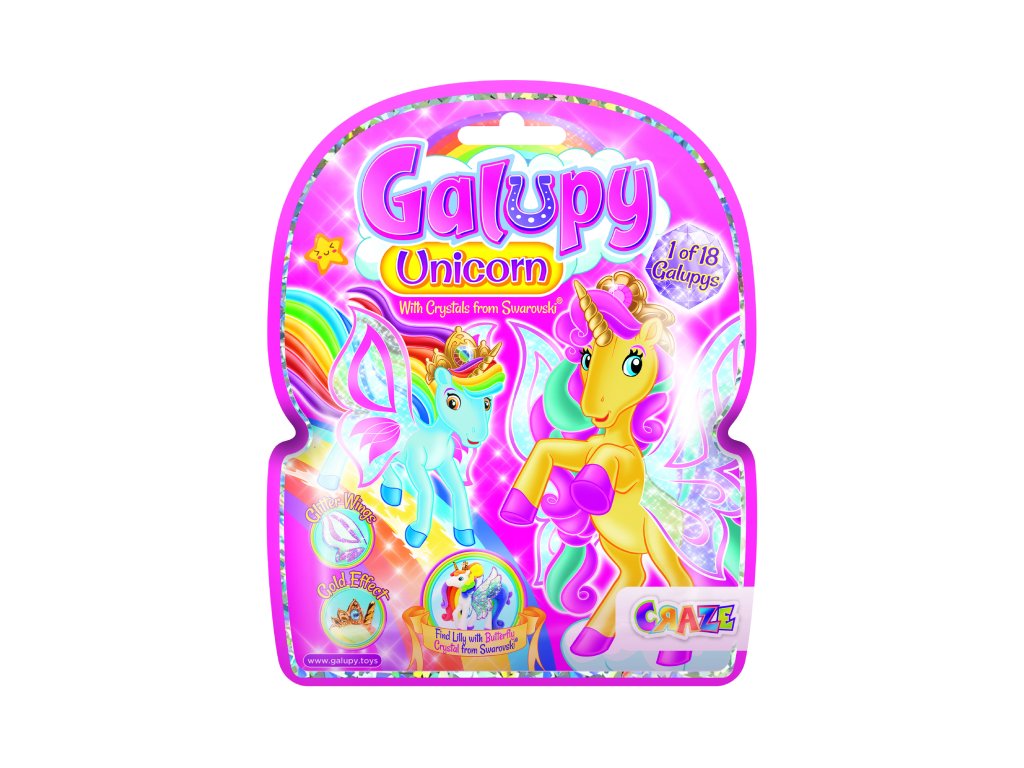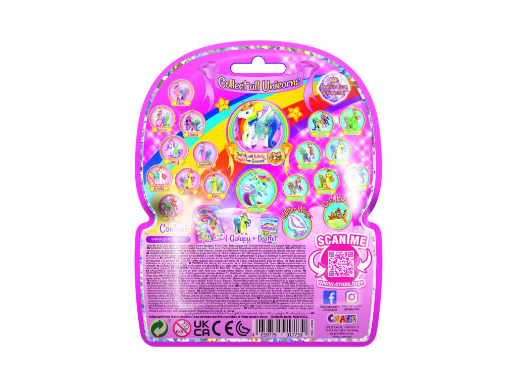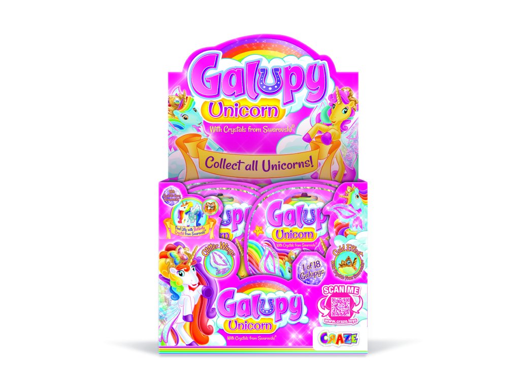 Galupy Winged Unicorns je kolekcia jednorožcov v sáčku. Každá figúrka jednorožca Galupy je jedinečná svojho druhu a má špecifické povahové črty, niektoré jednorožce Galupy majú dokonca magické schopnosti. Medzi nimi je aj jedna veľmi výnimočná Lilly, ktorá nosí v korunke kryštál Swarovski. Galupy sú vyrobené s veľkým dôrazom na detail, zachované v rozprávkovom štýle. Ich krídla sú pokryté trblietavou vrstvou, ktorá imituje trblietky a ich krídla žiaria zlatým efektom. Súčasťou každého vrecúška je leták s rozprávkovou grafikou a príbehom Galupy. Okrídlené jednorožce Galups sú ideálnym darčekom pre všetky malé aj veľké dievčatá, ktoré milujú fantastický svet kúziel a jednorožcov. V súprave je 18 jednorožcov, medzi nimi jeden jedinečný zdobený kryštálmi Swarovski. Výrobok sa zasiela náhodne, nie je možné vybrať si konkrétny model.