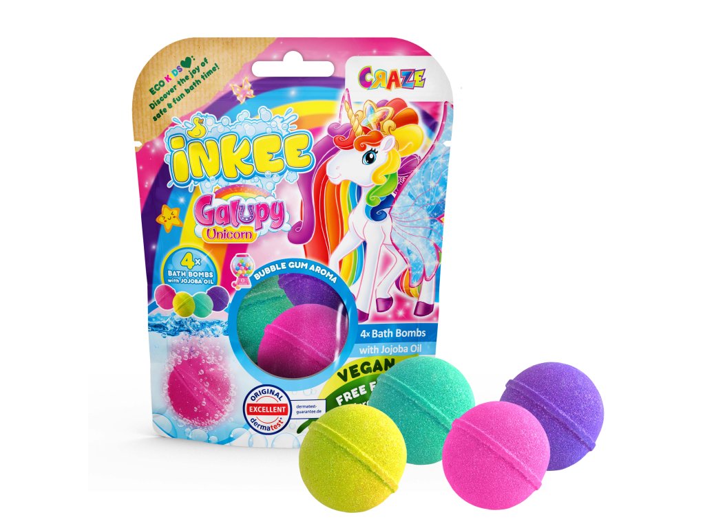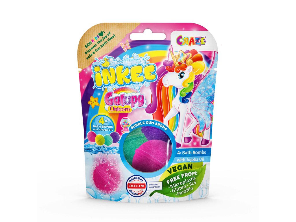 Guľôčky do kúpeľa INKEE Galupy Unicorn voňajú ako žuvačka, penia a majú krásne farby. Premenia vodu na farebný, perlivý kúpeľ. Každá guľôčka je obohatená o výživný jojobový olej a sľubuje voňavé potešenie. Štyri žiarivé farby v jednom vrecku.