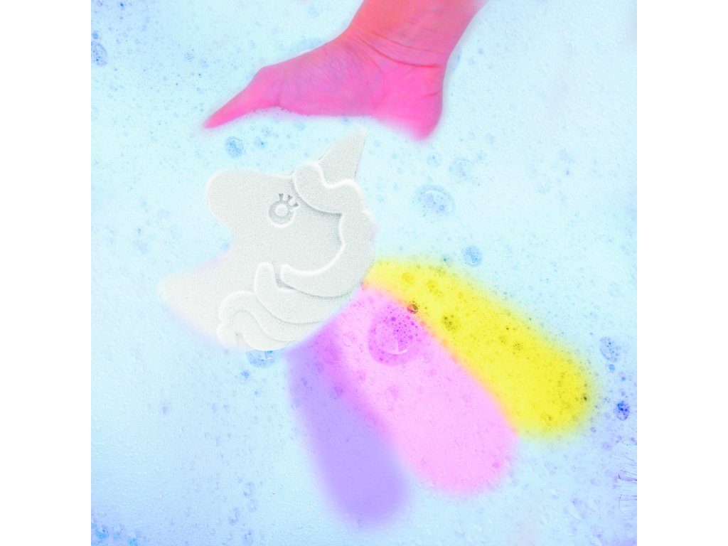 Šumivá bomba Unicorn pláva na hladine vody a premieňa vodu na more ružovej, fialovej a žltej farby.